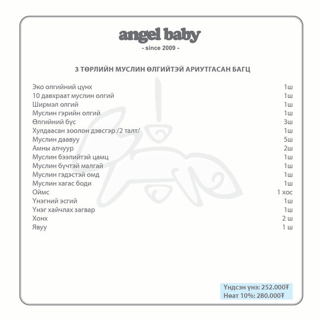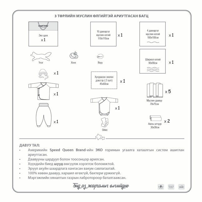 3 төрлийн муслин өлгийтэй ариутгасан багц